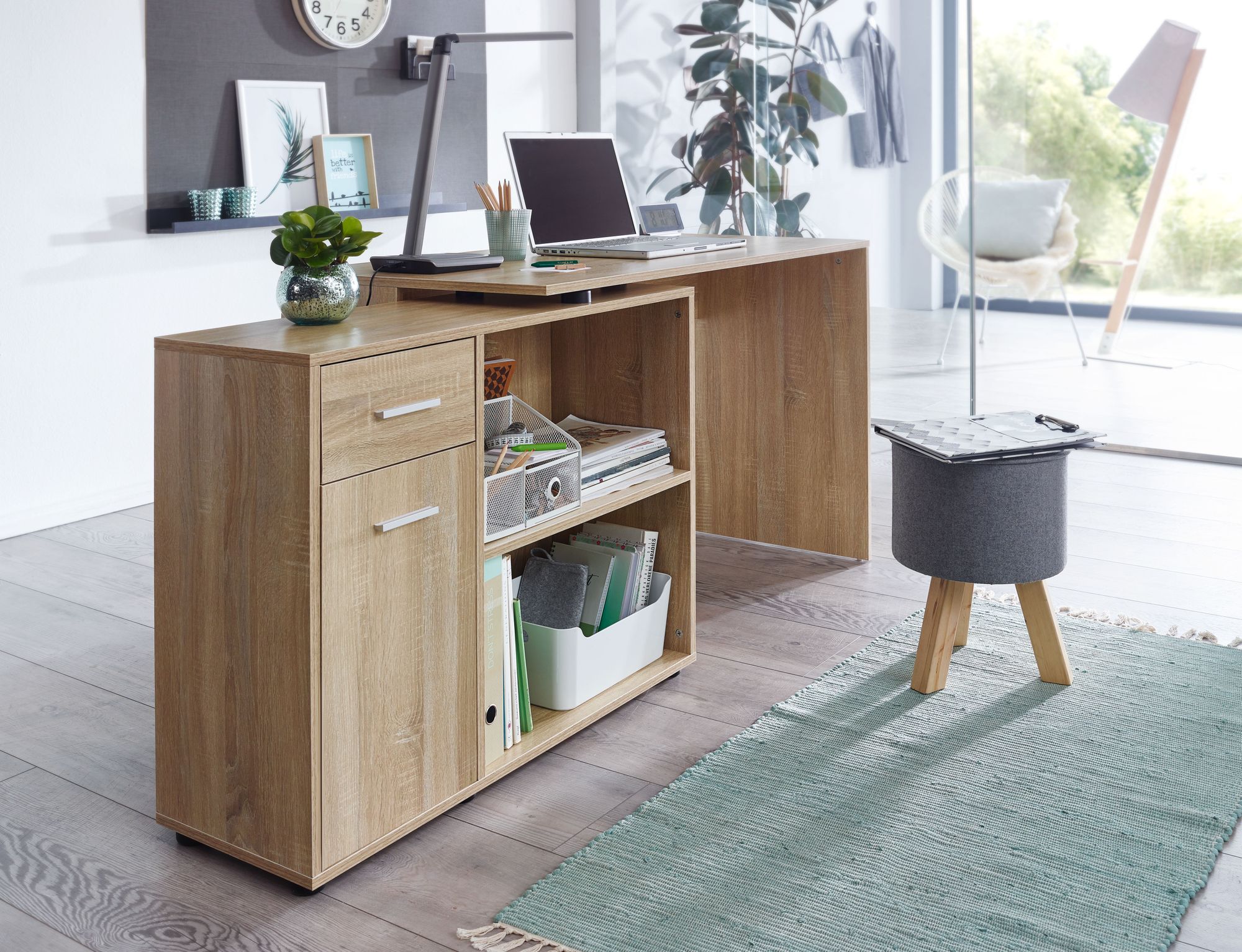 Optimieren Sie Ihren Arbeitsplatz mit diesem modernen Eckschreibtisch Sonoma mit integriertem Regal. Das praktische Design beinhaltet eine Tür, eine Schublade und Fächer, die Ordner im DIN A4 Format aufnehmen können, für eine organisierte und leichte Aufbewahrung.