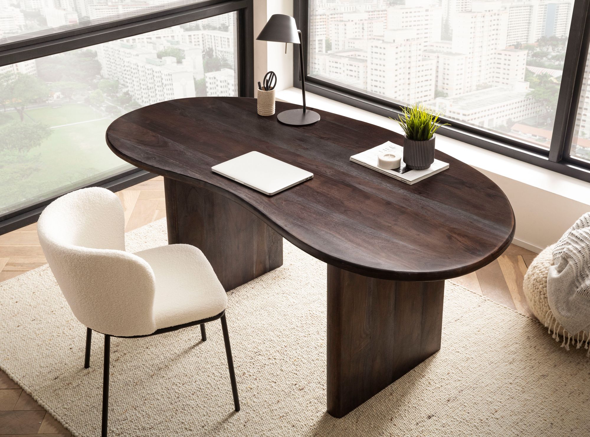Entdecken Sie diesen massiven Schreibtisch aus Akazienholz im Retro-Stil – ideal für das Homeoffice oder Büro. Die nierenförmige Tischplatte mit natürlicher Holzmaserung sorgt für ein warmes und einzigartiges Design.