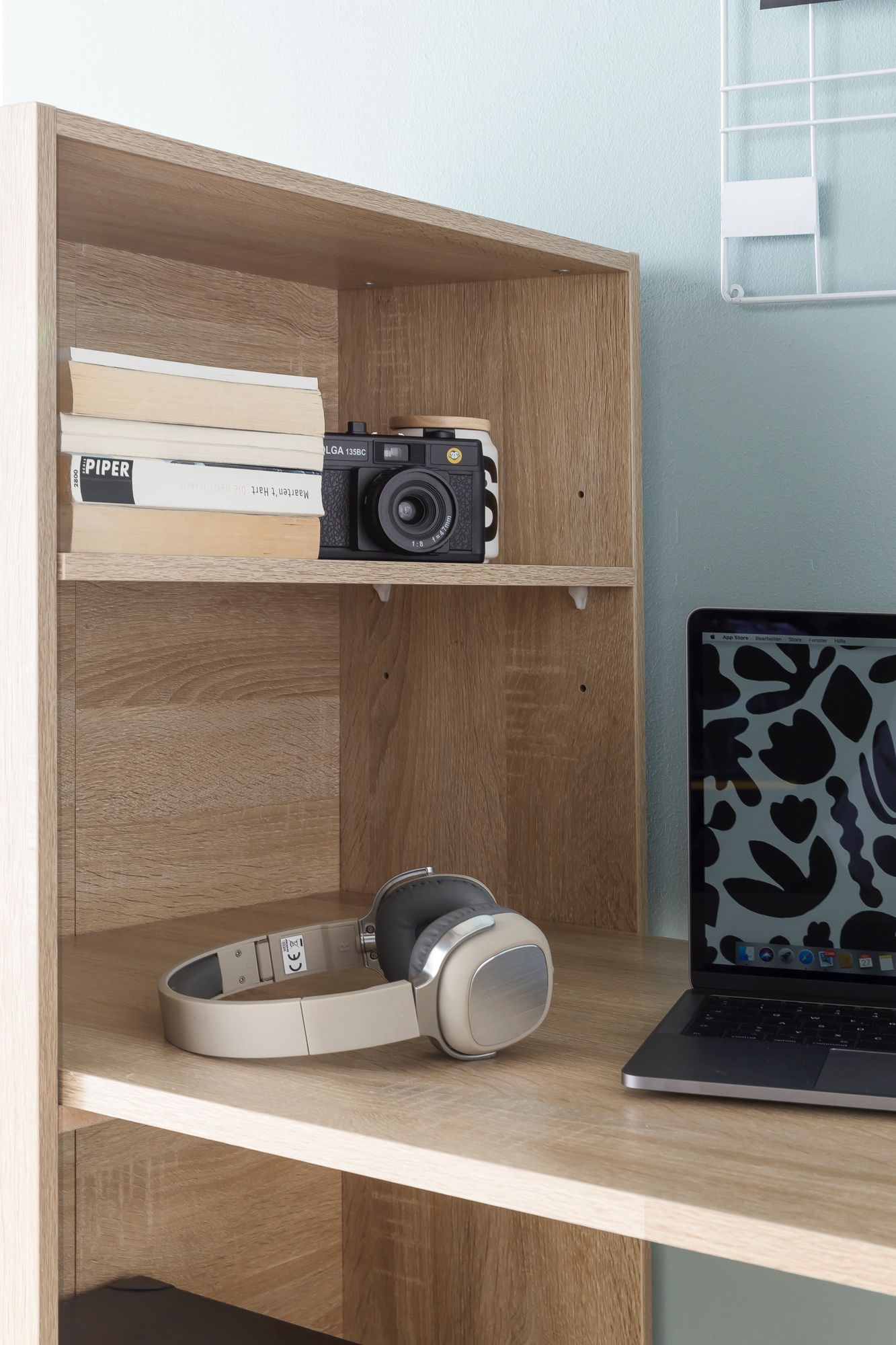 Moderner Schreibtisch mit Sonoma Spanplatten-Finish, das warme Töne mit funktionalem Design und integrierten Regalen für optimalen Stauraum verbindet.