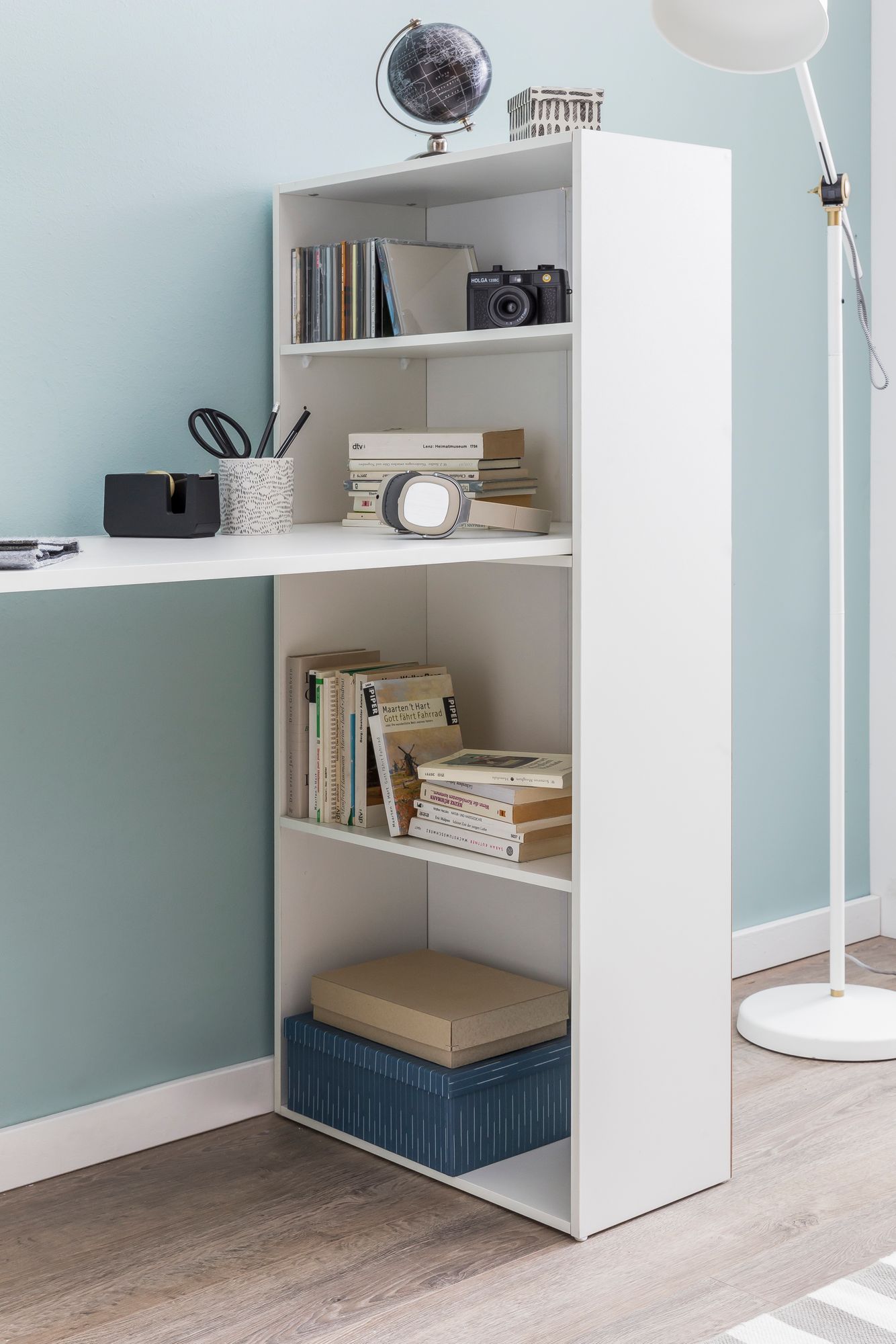 Moderner Schreibtisch aus weiß matt lackierter Spanplatte mit integriertem Regal, das praktischen Stauraum für Ordner und Büromaterial bietet.
